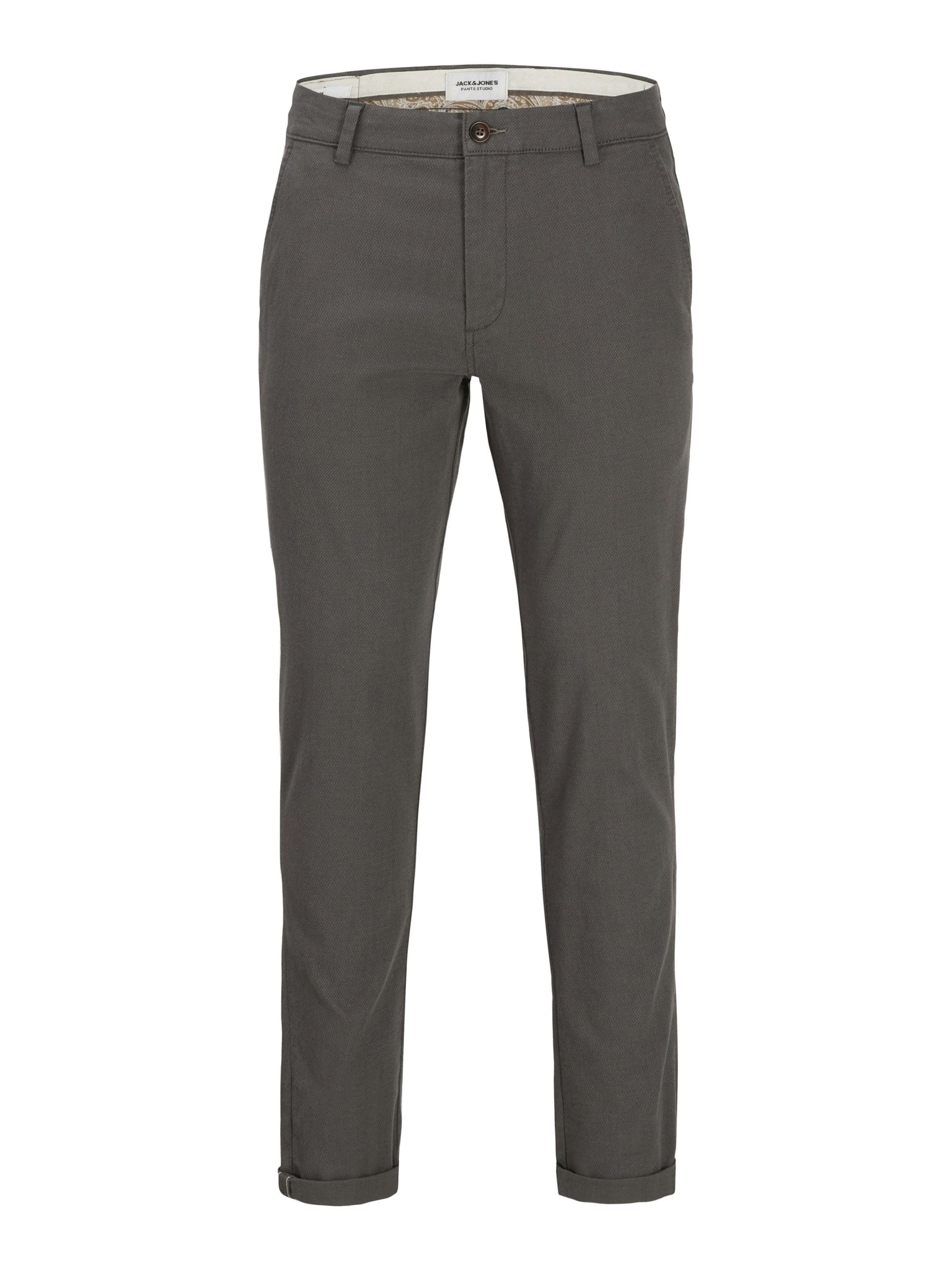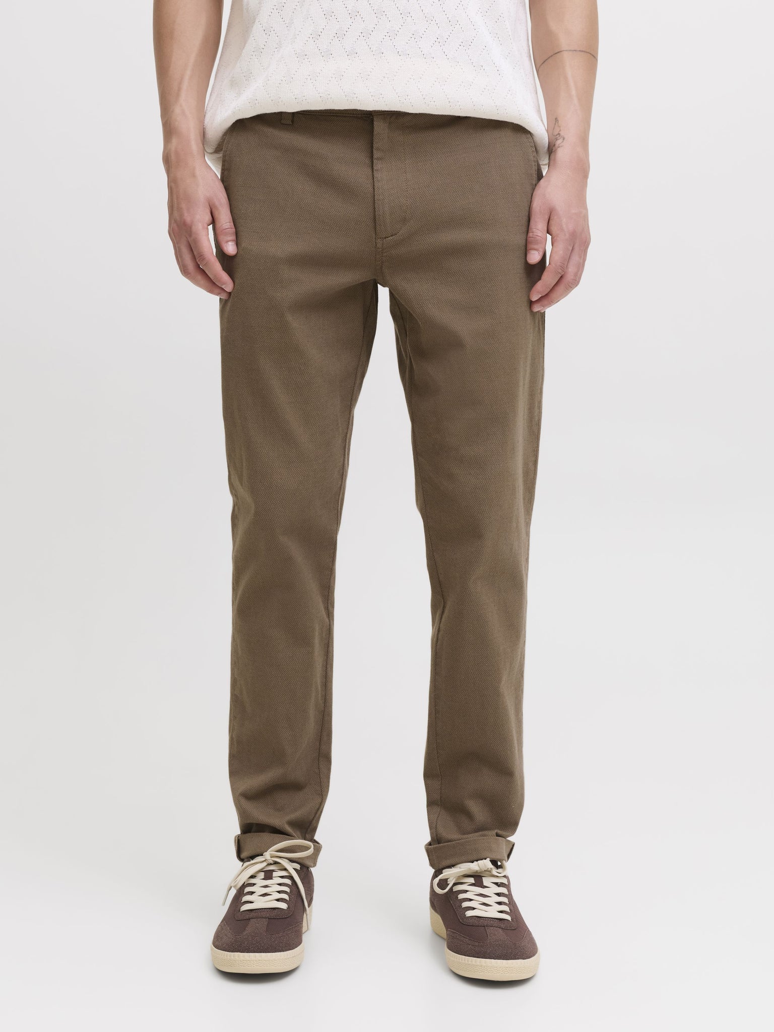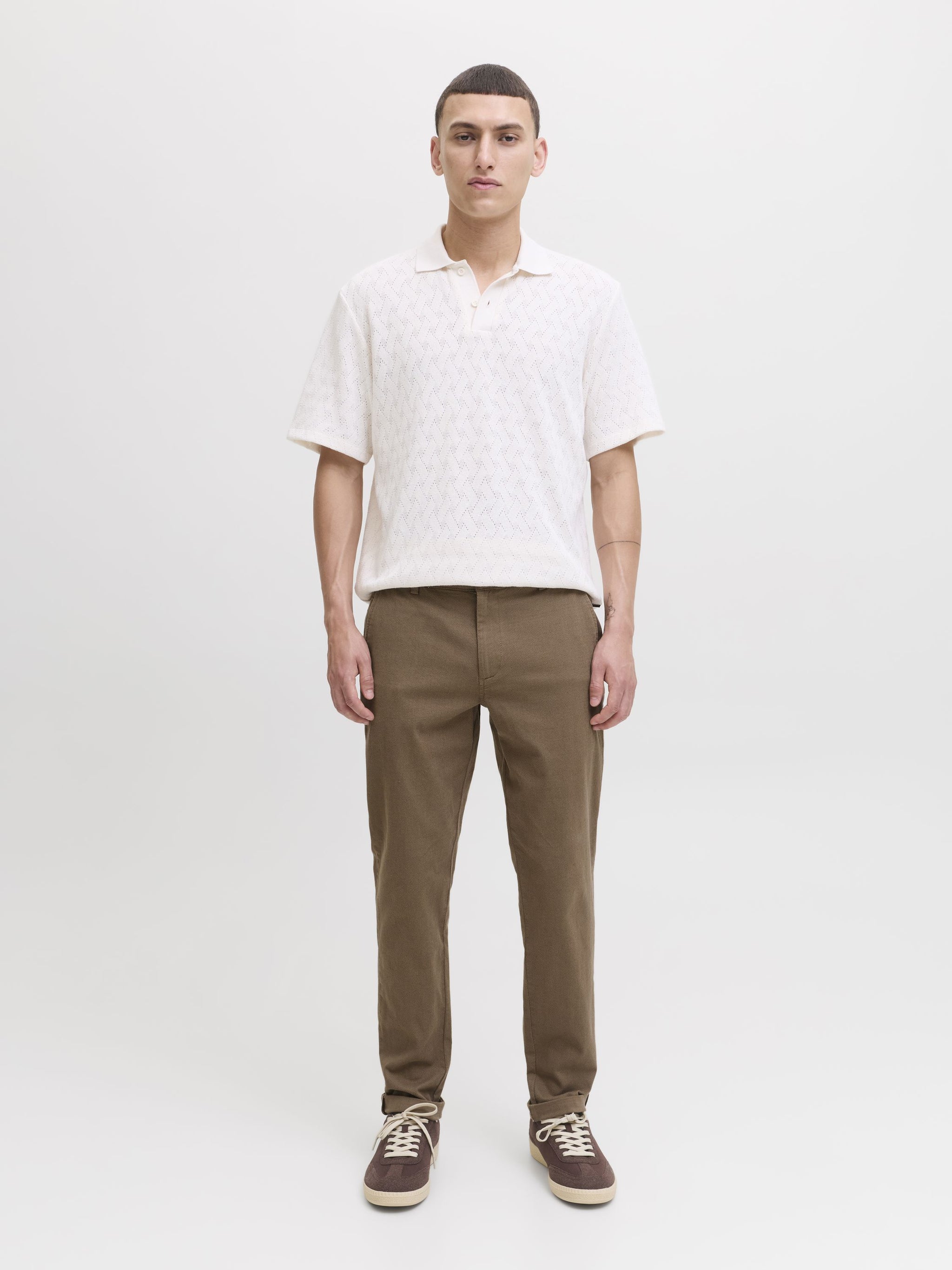 Diese Chinohose für Herren vereint die besten Elemente von formeller Anzughose und lässiger Five-Pocket-Jeans. Mit ihrem schlichten Styling und den Taschen vorne und hinten ist sie der ideale Begleiter für verschiedene Anlässe. Das besondere Design mit geometrischem Muster im Schaftgewebe verleiht der Hose eine elegante Note. Die Hose hat eine niedrige Taille und eine verkürzte, knöchellange Länge, die mit umgeschlagenen Säumen perfekt zur Geltung kommt. Der Slim Fit sorgt für eine moderne Passform mit schmalem Oberschenkel, Knie und enger Beinöffnung. Ein zeitloser Klassiker, der in keinem Kleiderschrank fehlen sollte.