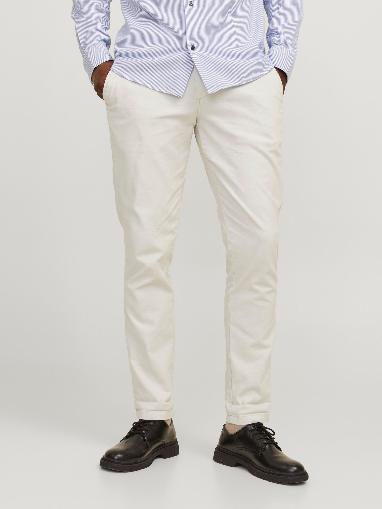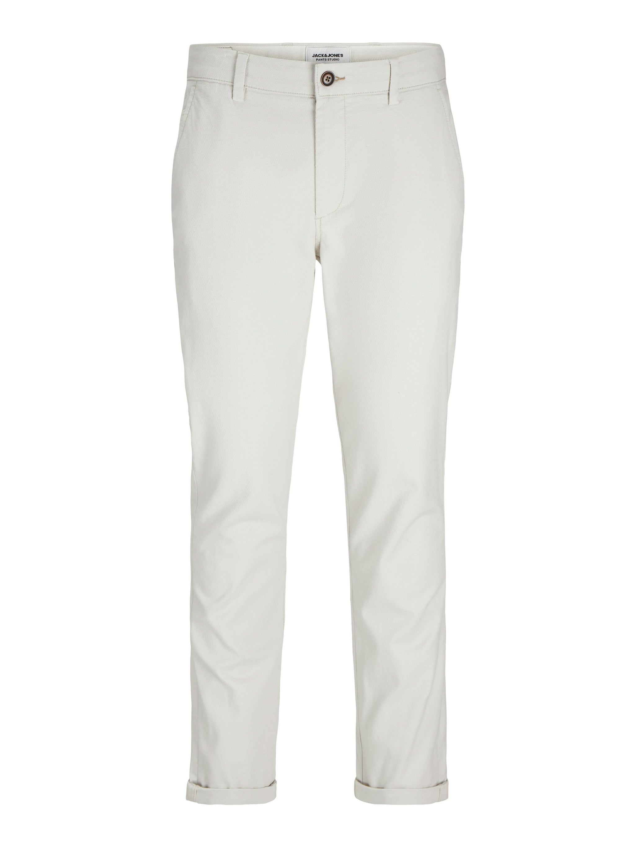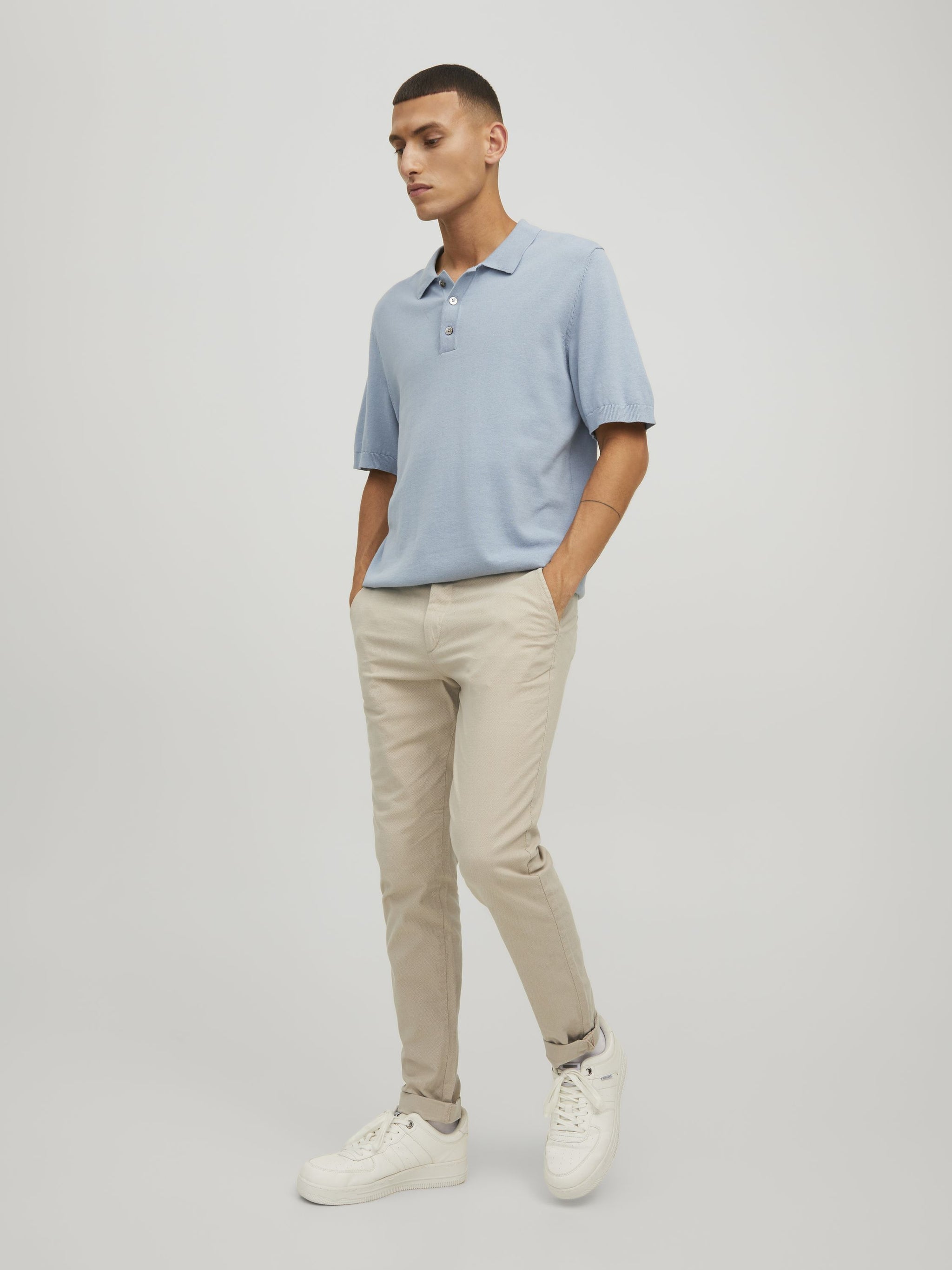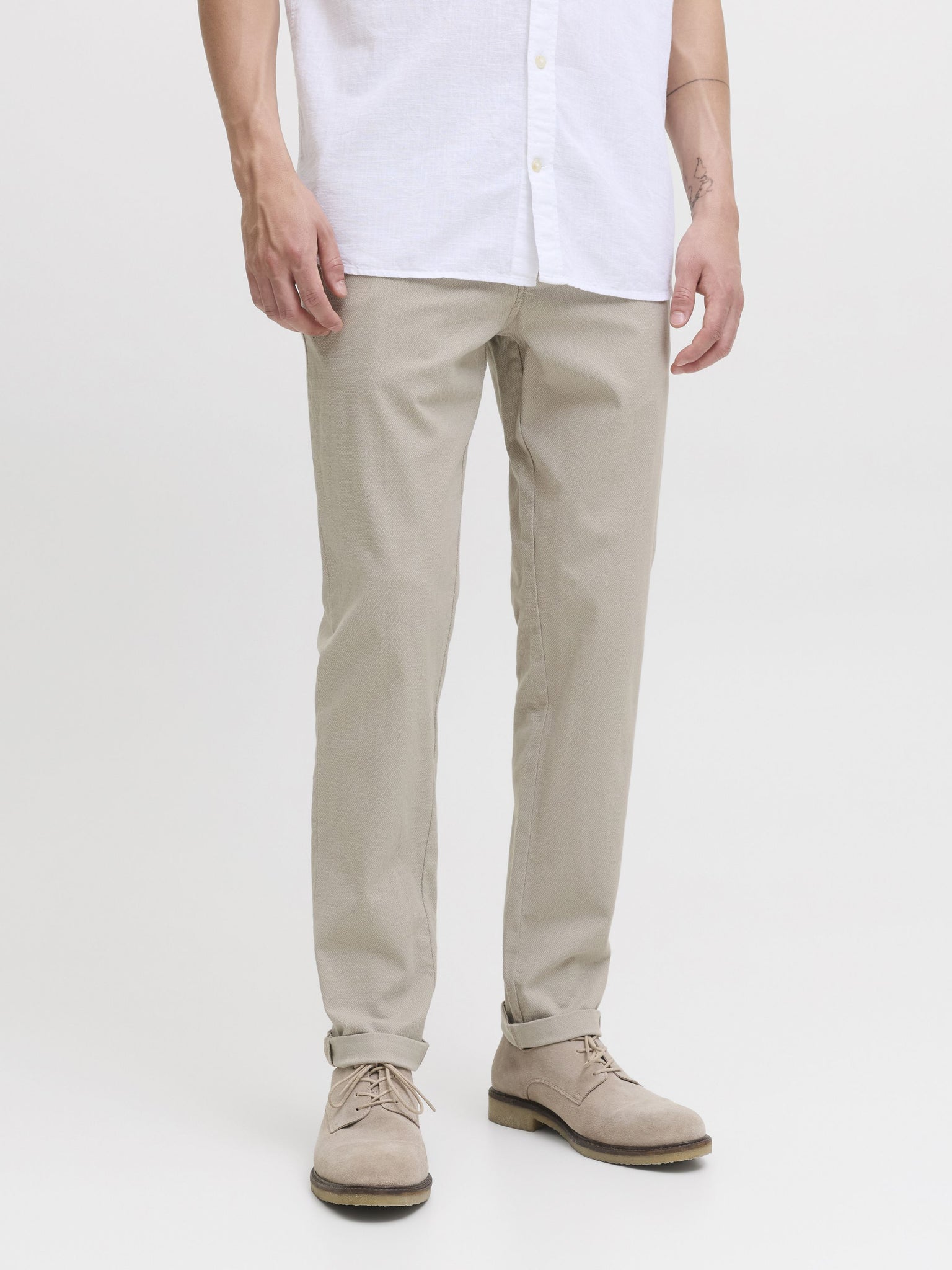 Diese Chinohose für Herren vereint die besten Elemente von formeller Anzughose und lässiger Five-Pocket-Jeans. Mit ihrem schlichten Styling und den Taschen vorne und hinten ist sie der ideale Begleiter für verschiedene Anlässe. Das besondere Design mit geometrischem Muster im Schaftgewebe verleiht der Hose eine elegante Note. Die Hose hat eine niedrige Taille und eine verkürzte, knöchellange Länge, die mit umgeschlagenen Säumen perfekt zur Geltung kommt. Der Slim Fit sorgt für eine moderne Passform mit schmalem Oberschenkel, Knie und enger Beinöffnung. Ein zeitloser Klassiker, der in keinem Kleiderschrank fehlen sollte.