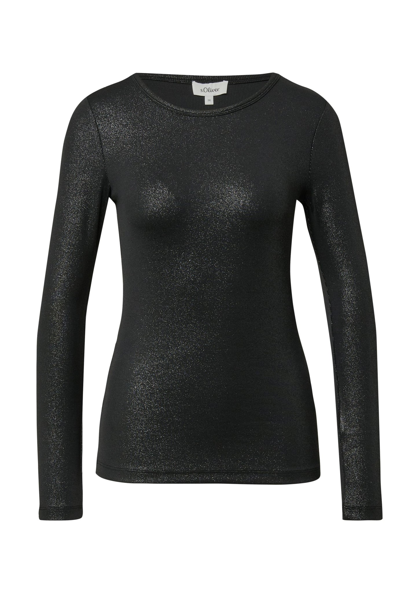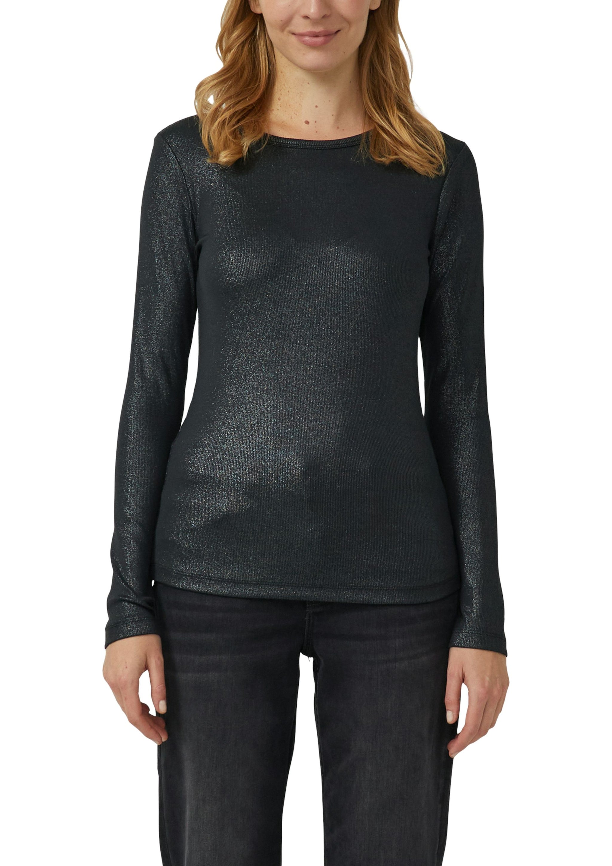 Dieses fließende Langarm-Shirt mit glitzerndem Coating verzaubert in softem Jersey-Ripp. Der abgerundete Saum und die schmale Passform schmeicheln deiner Silhouette - perfekt für entspannte Casual-Looks mit Glamour-Faktor.