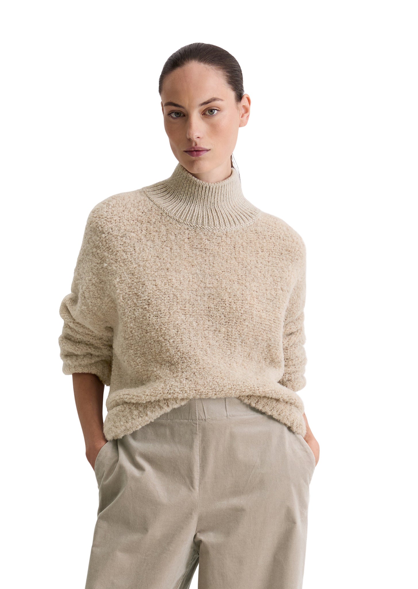 Pullover sind nach wie vor eines der wichtigsten Statement-Pieces in dieser Saison! Unser Modell aus supersoftem Bouclé-Garn aus einem edlen Schurwolle-Alpakawolle-Mix bietet neben einem zeitlosen, modernen Look eine angenehme, kuschelige Haptik. Der gestrickte Pullover hat einen gerippten hohen Turtleneck aus extrafeiner Merinowolle, überschnittene Schultern sowie gerippte Bündchen an den Ärmelabschlüssen und am Saum. Er ist bequem und leger geschnitten. Ein Qualitätsmerkmal sind die in Form gestrickten Fully-Fashioned-Details an der Ärmelnaht, die ohne Zuschnitt auskommen und so Garnabfall vermeiden. Edel: die "französische Schulter" - hier liegt die Schulternaht nicht am höchsten Punkt, sondern ist lässig nach hinten versetzt.