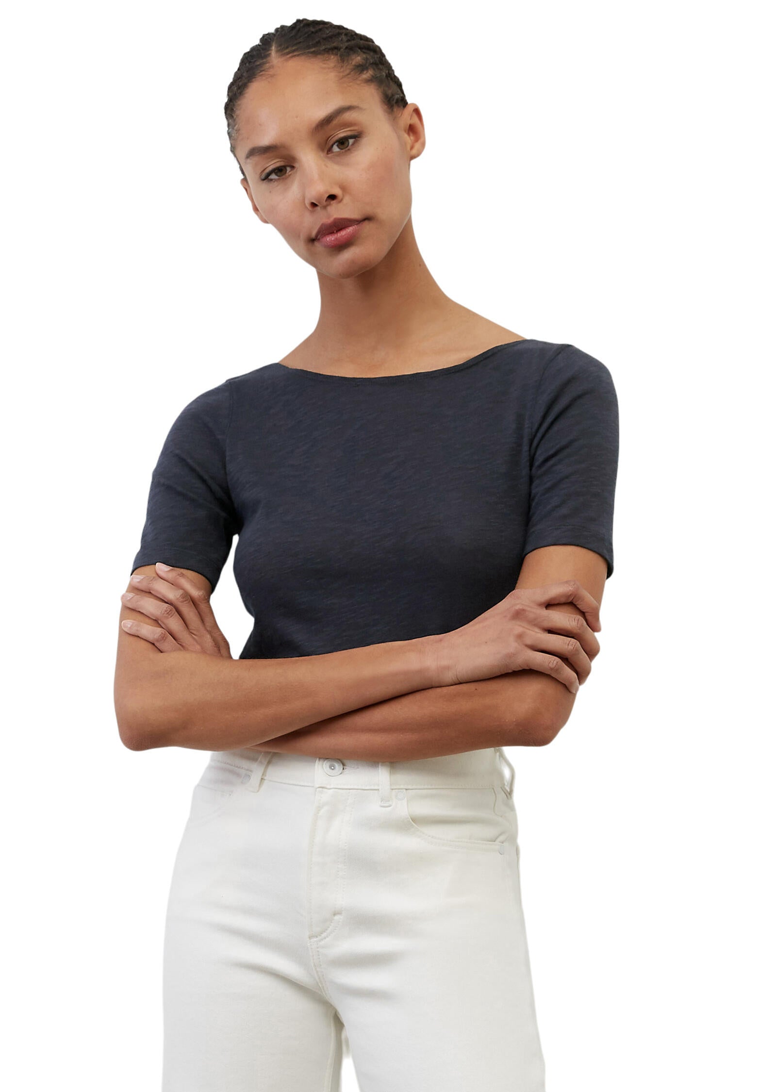 - Kragenform: U-Boot-Ausschnitt