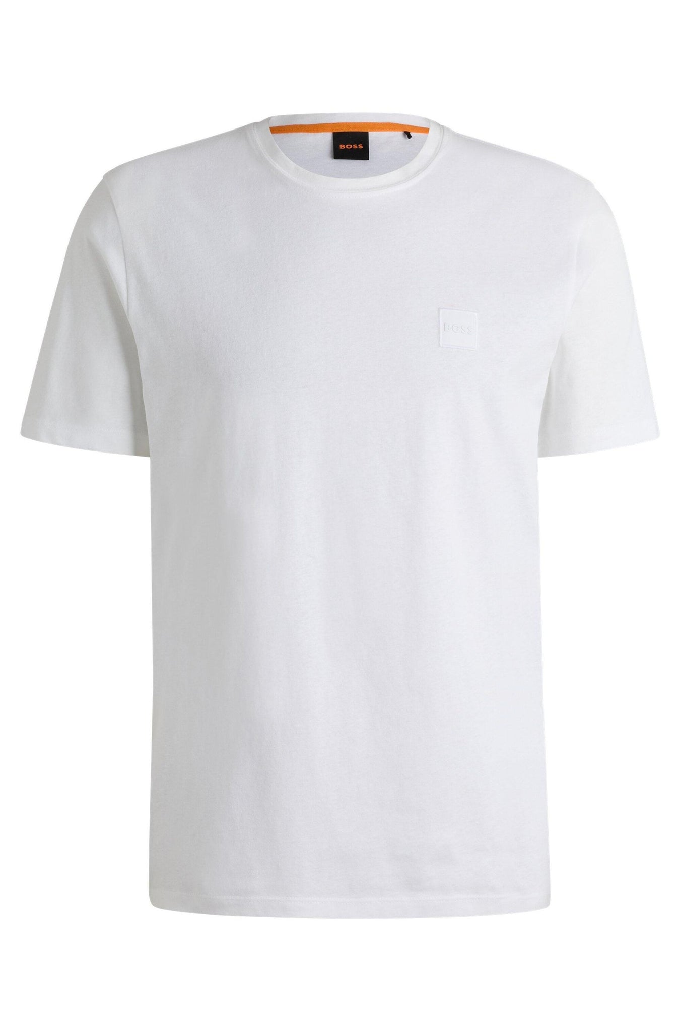 Gerade geschnittenes BOSS T-Shirt mit gewebtem Logo-Aufnäher. Aus mittelschwerem, softem Baumwoll-Jersey. Dazu passt eine Casual-Hose.