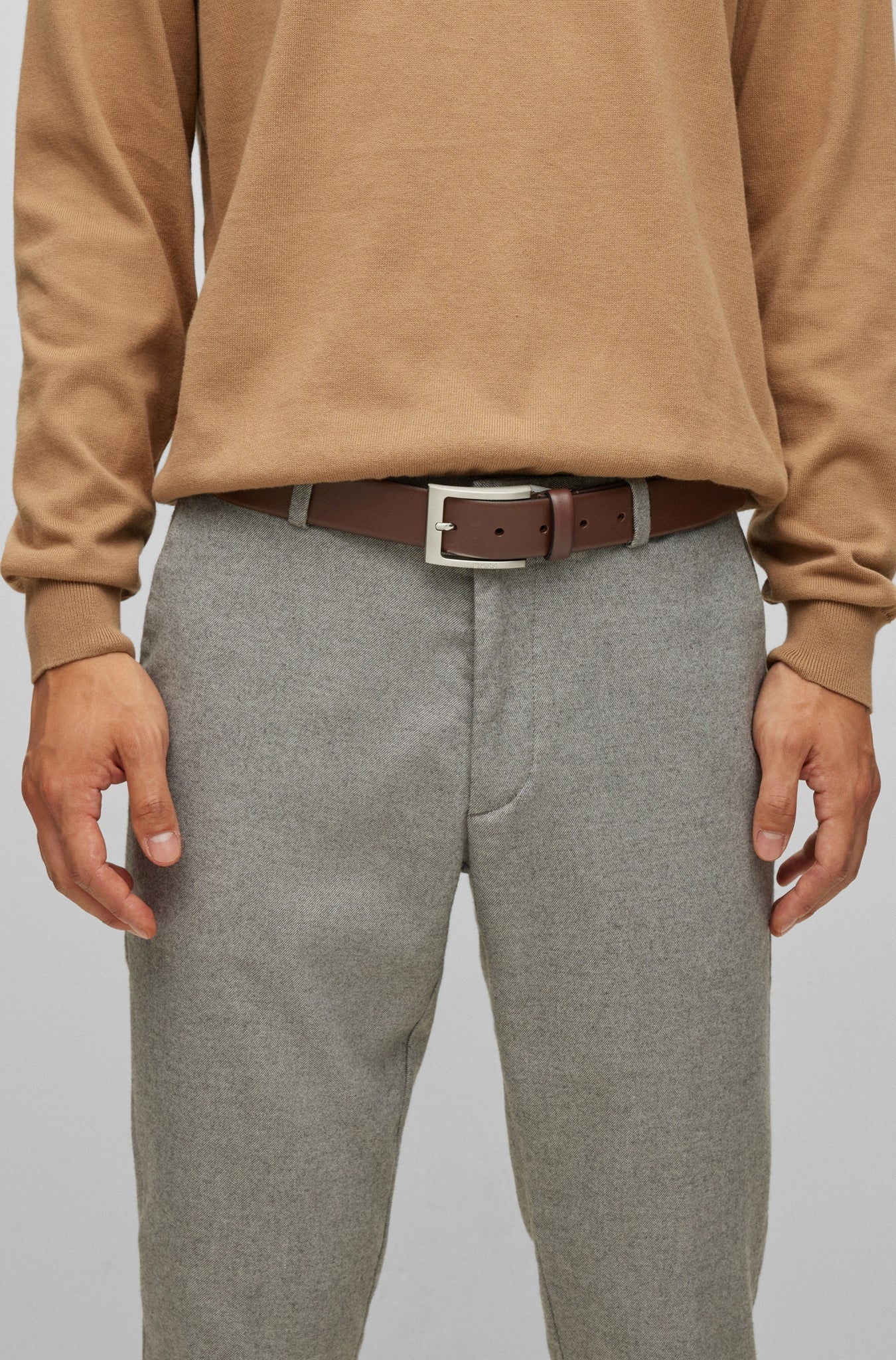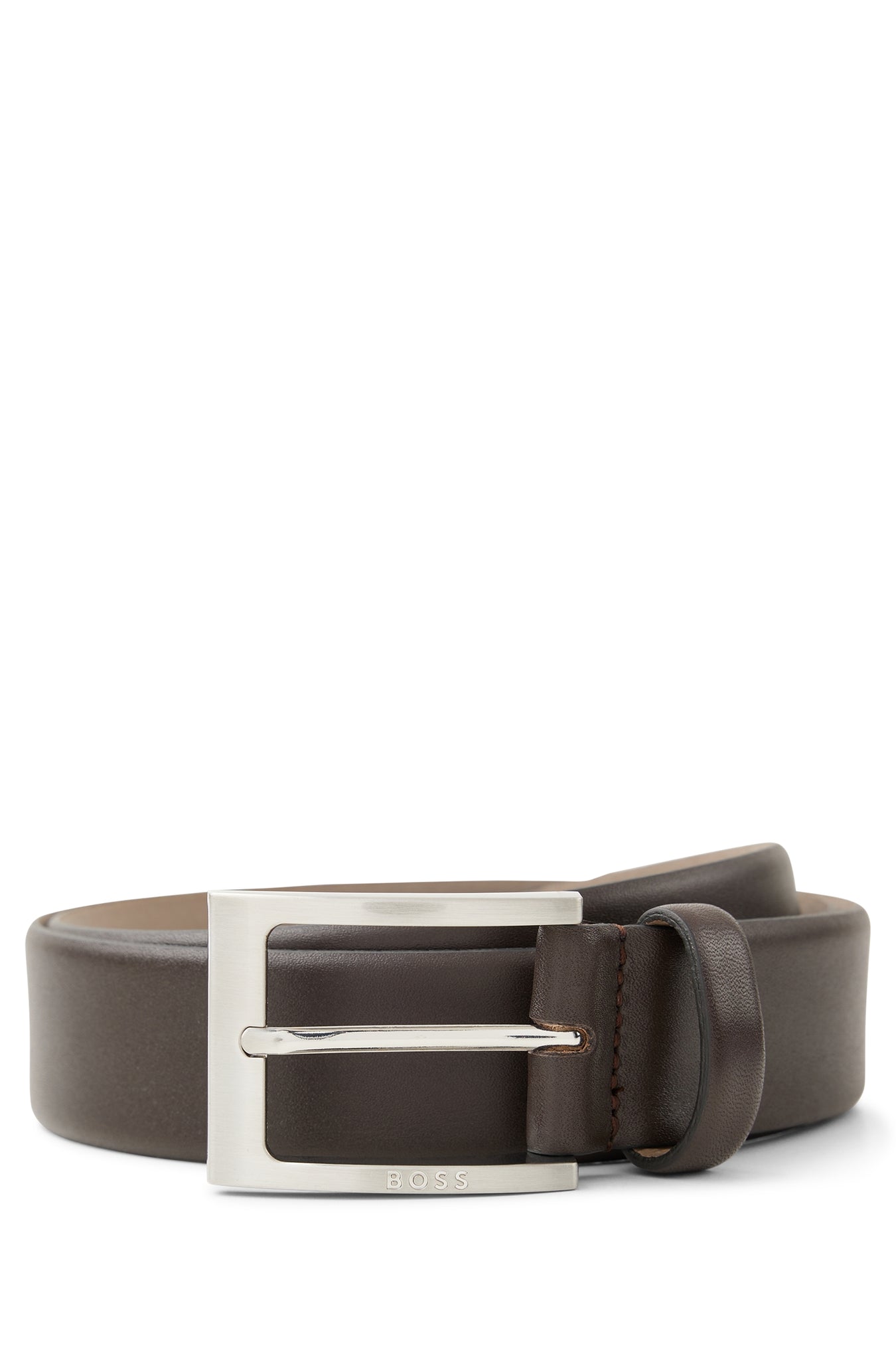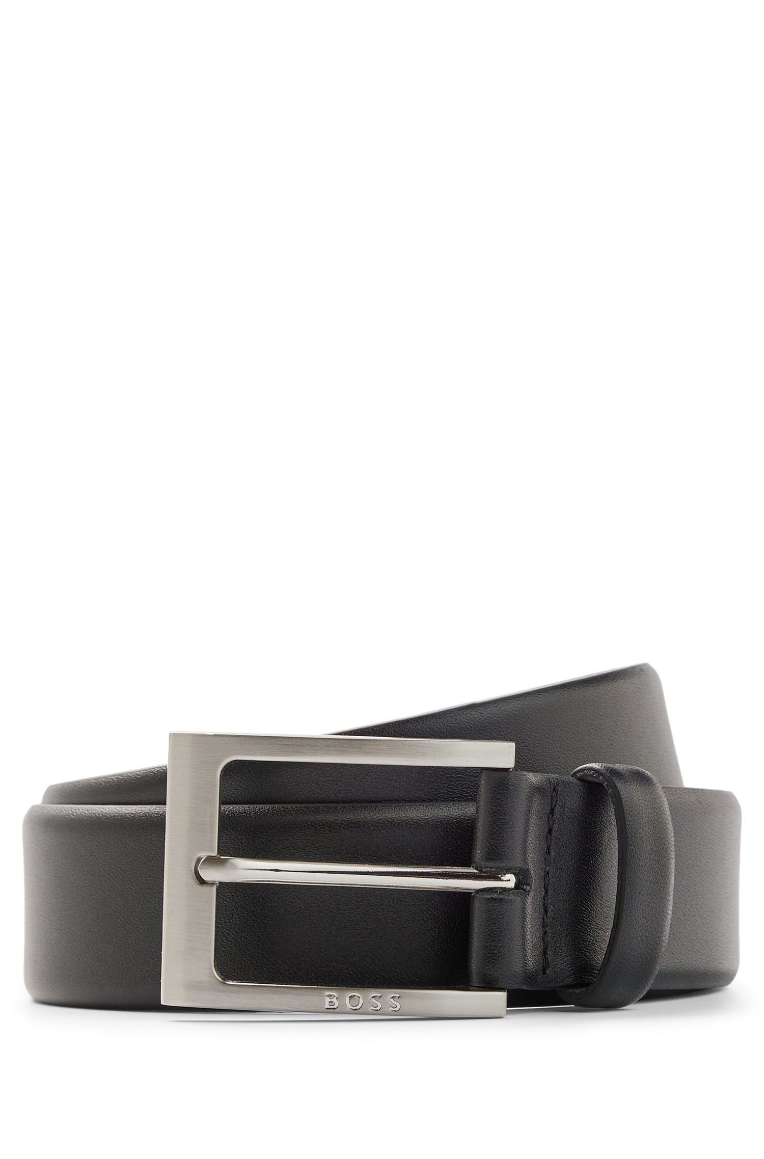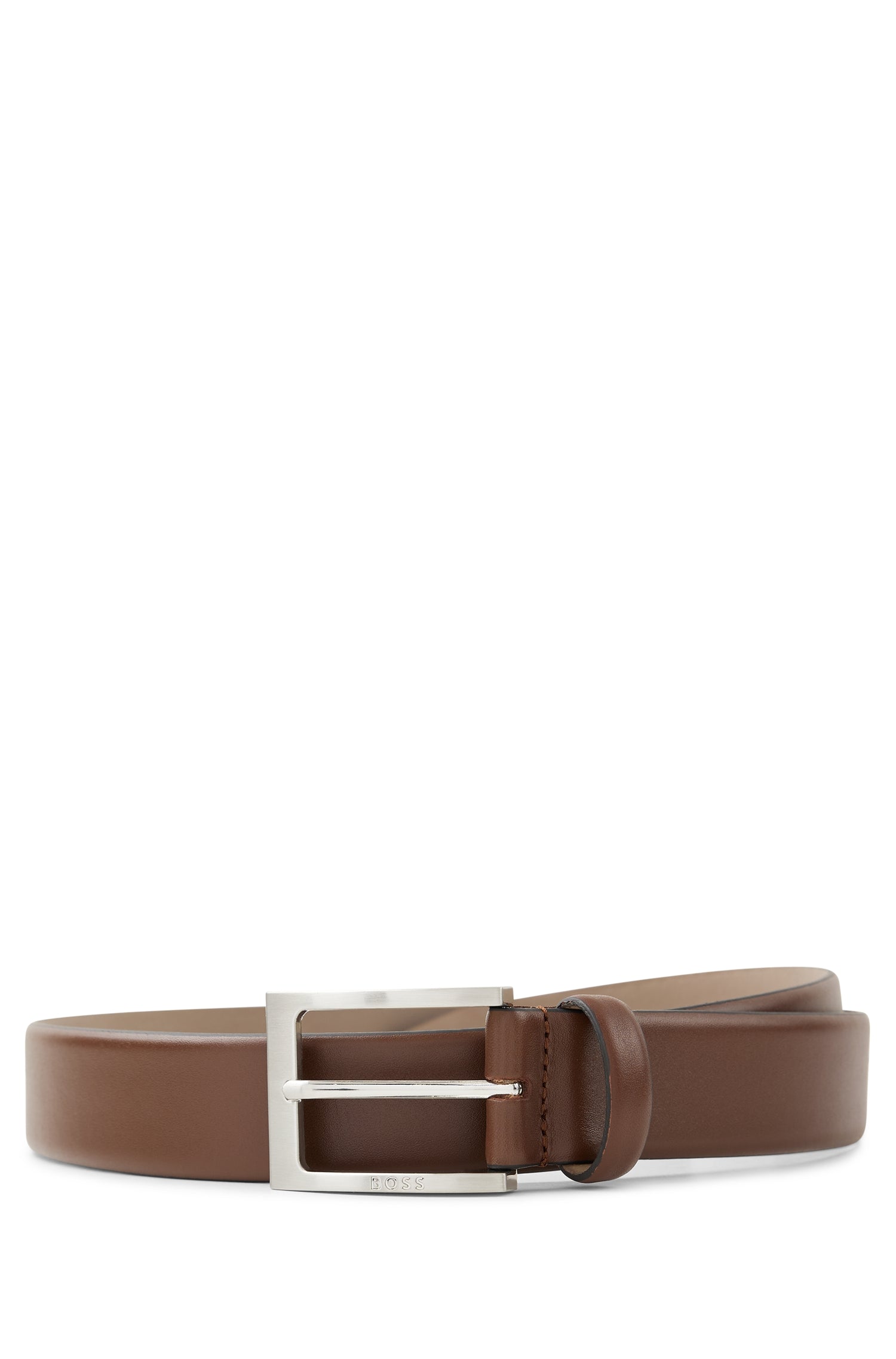 • Zeitloser BOSS Gürtel. Das elegante Accessoire aus edlem Nappaleder überzeugt mit einer Dornschließe mit gebürstetem und poliertem Finish. Die BOSS Logo-Gravur auf dem Metall-Detail sorgt für einen unverwechselbaren Touch. Für eine optimale Passform sollte der Gürtel eine Größe größer als Ihr Taillenumfang sein.