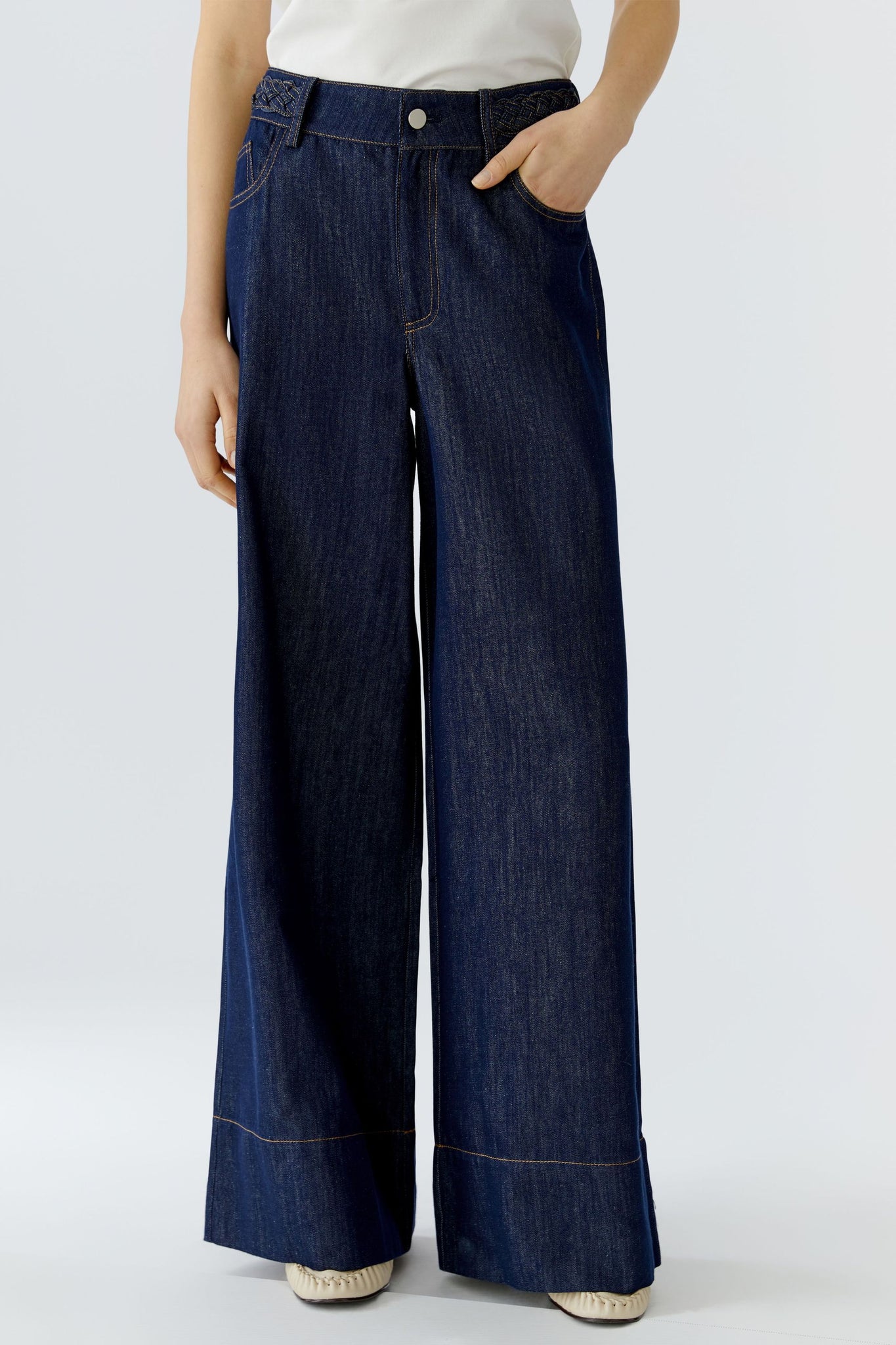 Leichte Denimmischung, in raw denim Farbe High waist, wide leg, reguläre Länge Denim typische Bundlösung mit Gürtelschlaufen, Knopf und Reißverschluss Klassische Five-Pocket Breit abgenähter Saum * Länge bei Größe 36: 80cm