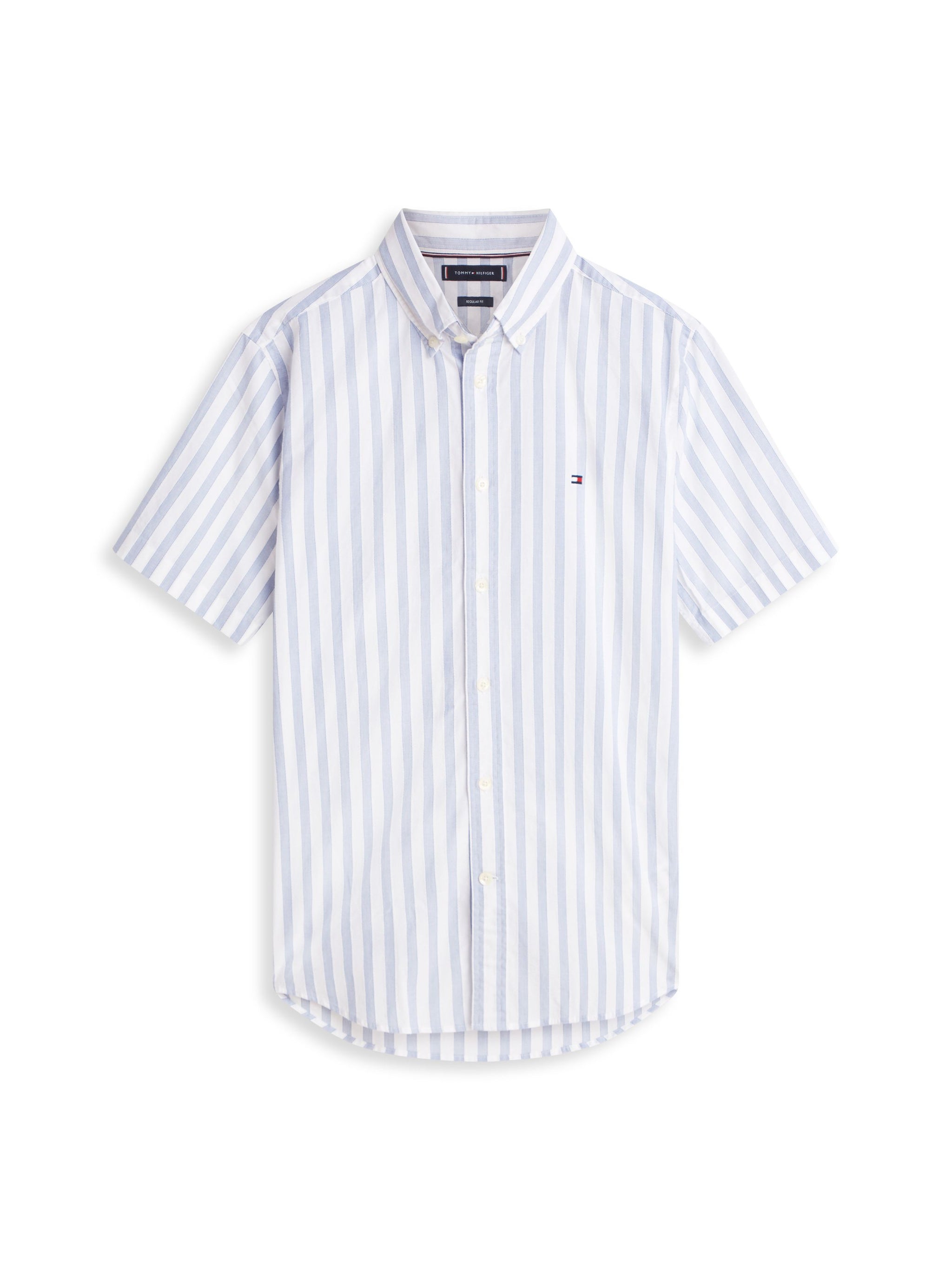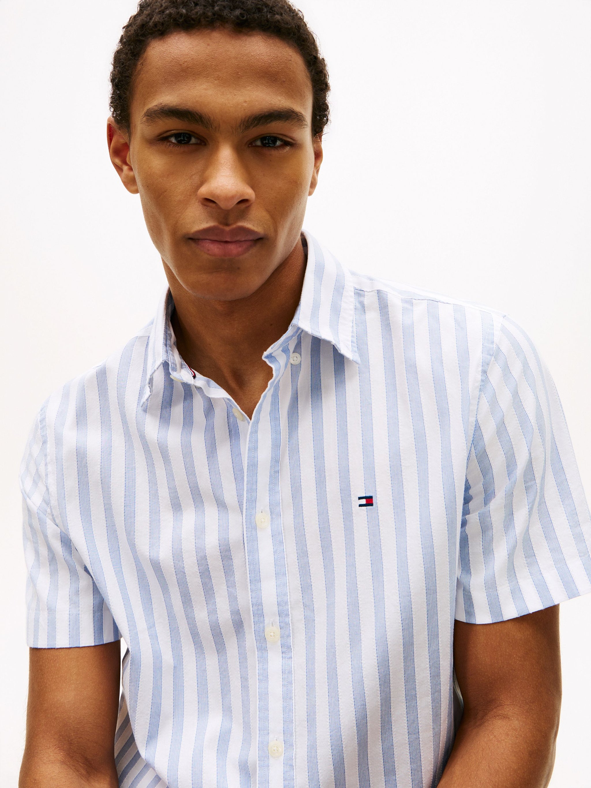 • Refresh your warm-weather options with this short-sleeved shirt, made from an airy stretch cotton dobby with a timeless vertical stripe.Highlights Stretch cotton dobby All-over vertical stripe Button-down collar Shirttail hem Signature tape inside neckline Tommy Hilfiger branding Tommy Hilfiger flag embroidery on chestShape & fit Regular fit Short sleevesComposition & care 96% cotton, 4% elastane