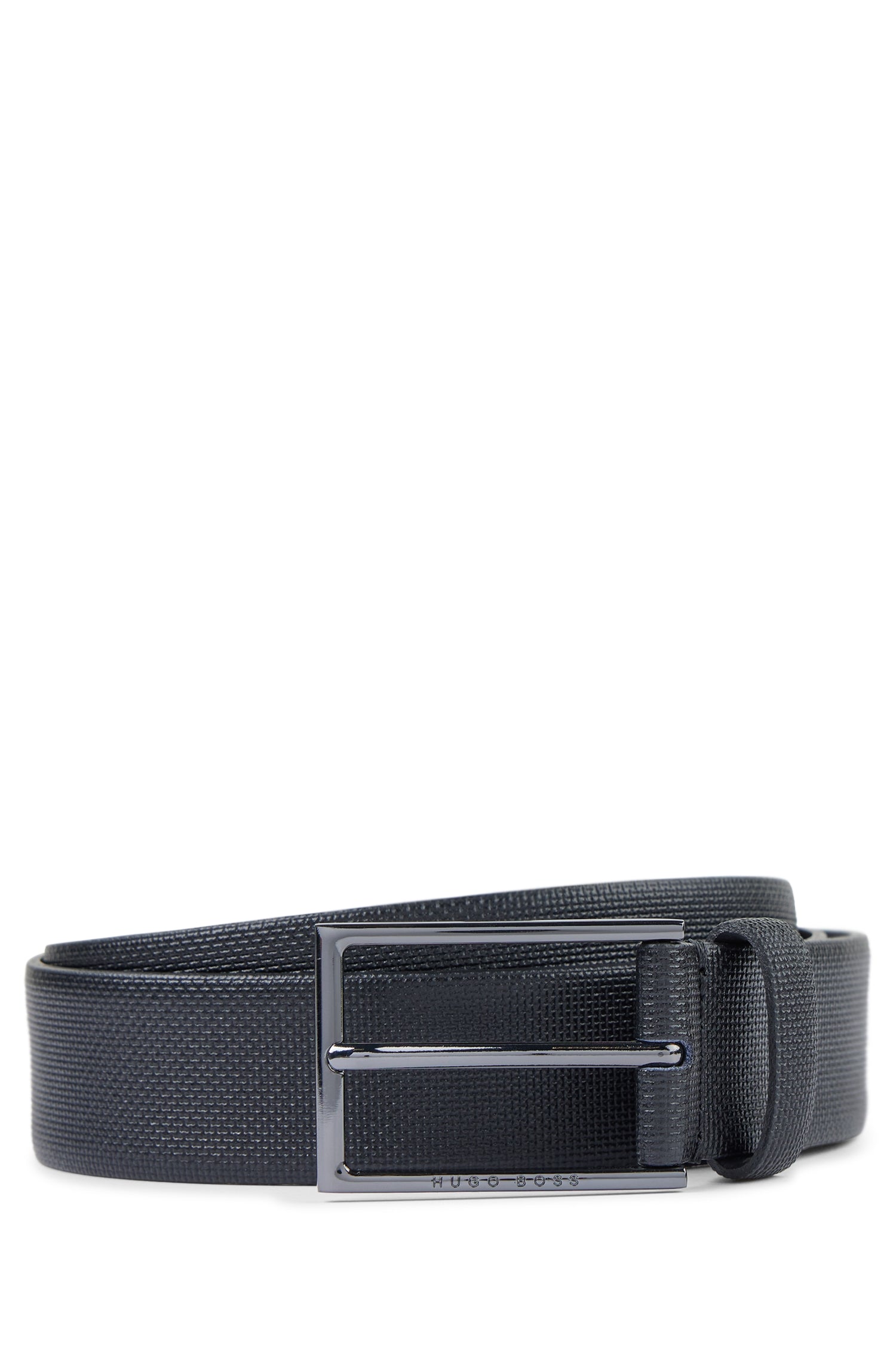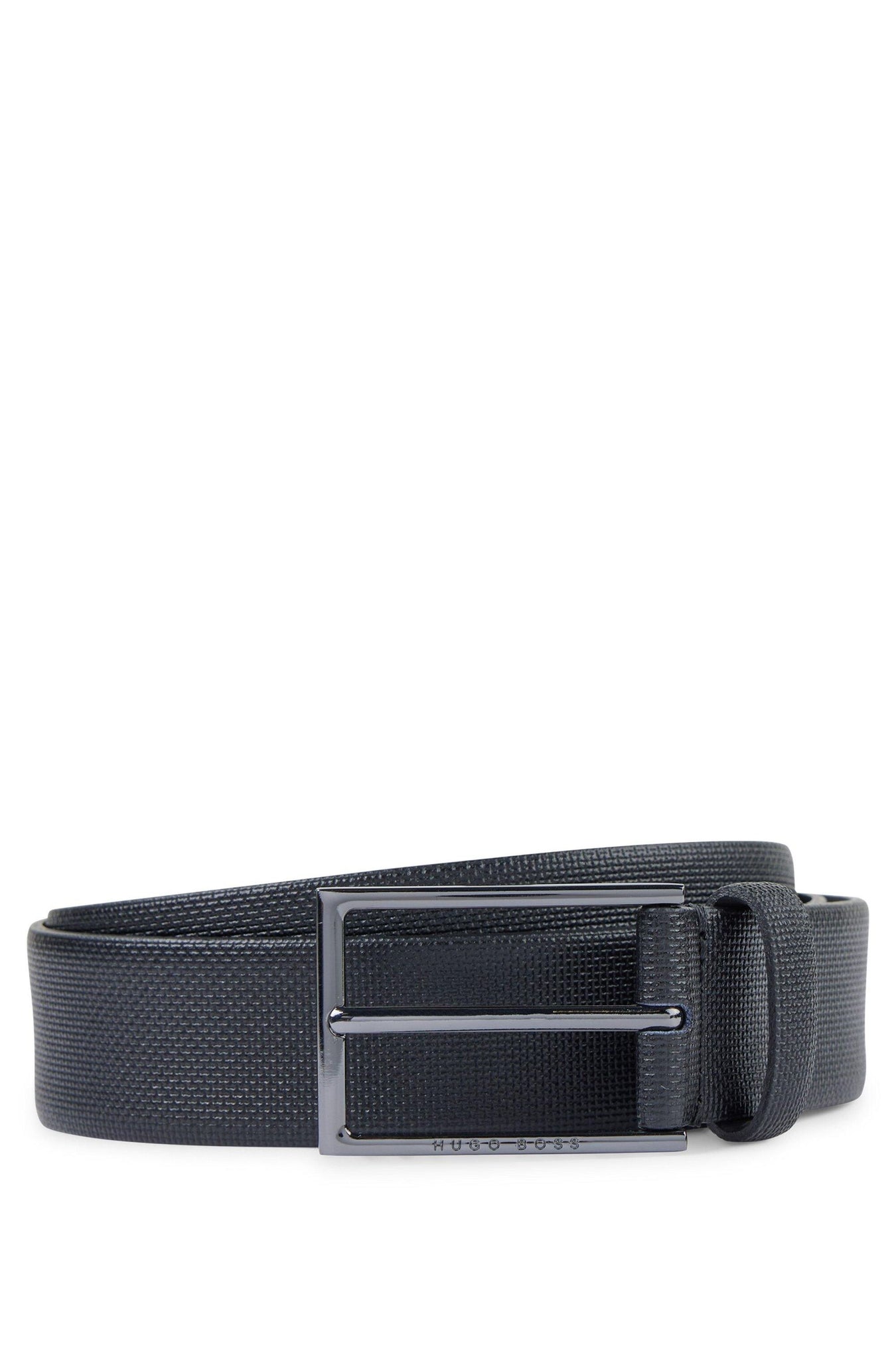 Eleganter BOSS Gürtel. Das Herren-Accessoire wird in Italien aus geprägtem Leder gefertigt und durch eine polierte Metall-Schließe mit Logo-Gravur abgerundet. Verleihen Sie Ihrem Business-Outfit den letzten Schliff. Für eine optimale Passform sollte der Gürtel eine Größe größer als Ihr Taillenumfang sein.