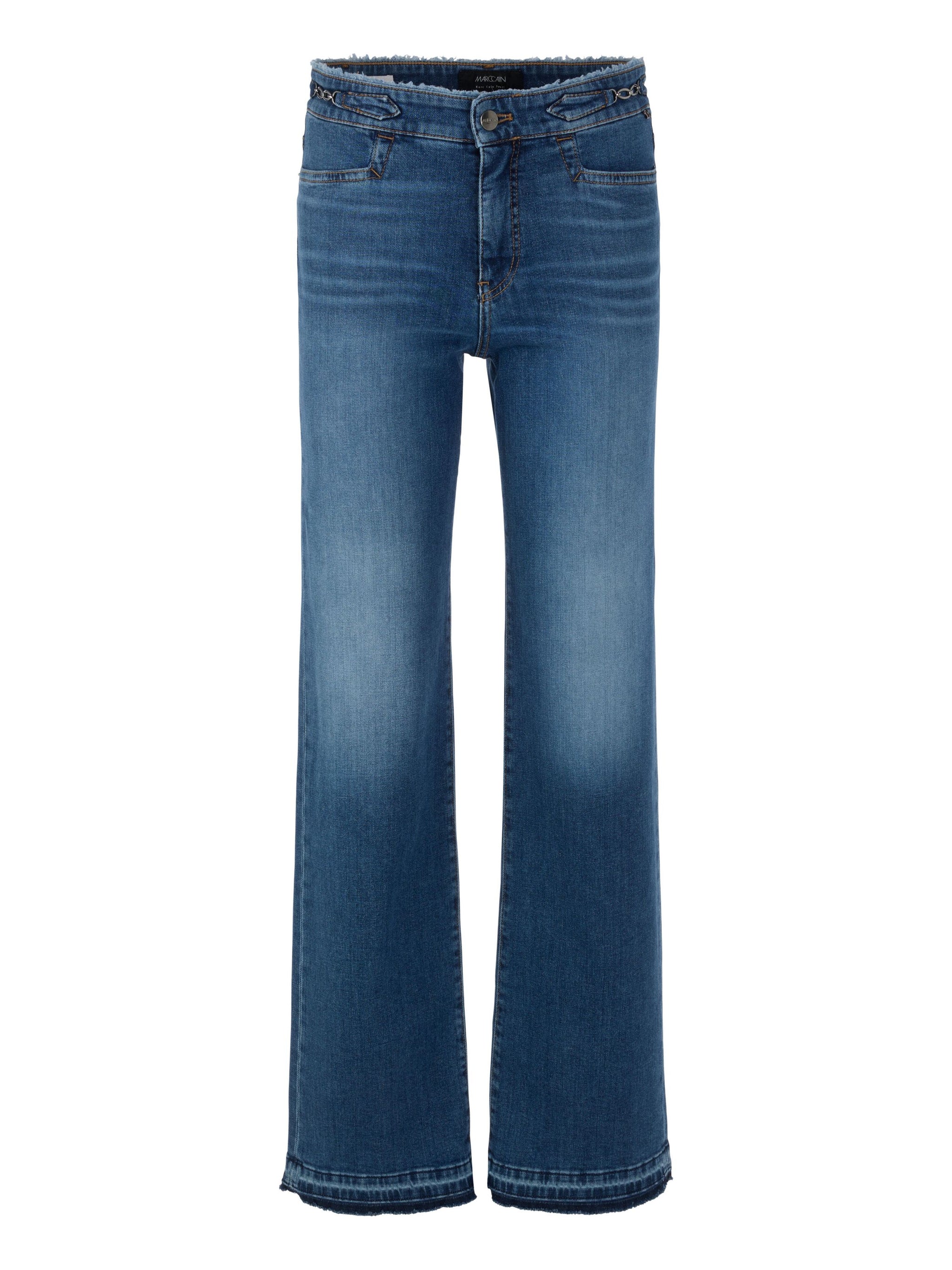 Die Jeans FAID präsentiert sich im Feminine Fit mit hoher Taille und ausgestelltem Bein. Das verlängerte Bein mit offenem Saum sorgt für eine elegante Silhouette. Der Bund wird durch eingearbeitete Fransen und Zierketten an den Hüften zum Eyecather. Die eckigen Eingrifstaschen runden das Design ab. Geschlossen wird das Modell mit Knopf und Zipper.
