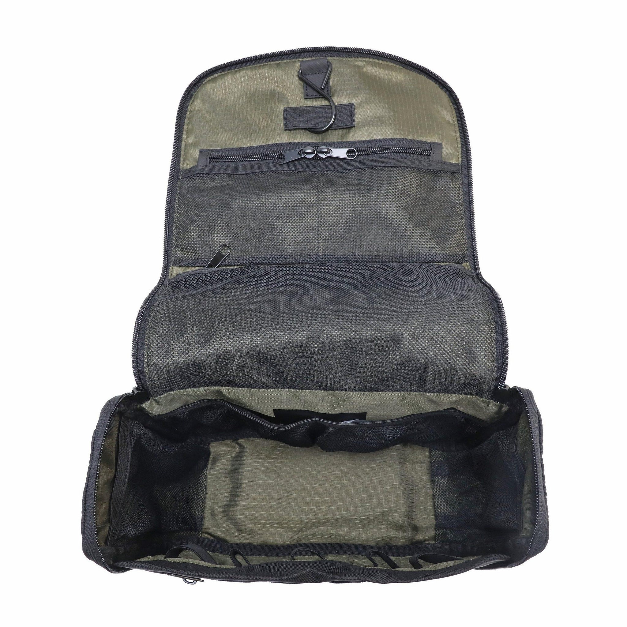 Außen: * schwarzes Nylon * schließt mit Reißverschluss * ein Henkel (Länge ca. 5 cm) * Reißverschlussfach auf der Vorder- und Rückseite * schwarze Plastikdetails * mit Aufhänger Innen: * Innenfutter aus khakifarbenem Textil * ein Hauptfach * zwei Reißverschlussfächer * vier Steckfächer * sechs elastische Halteschlaufen