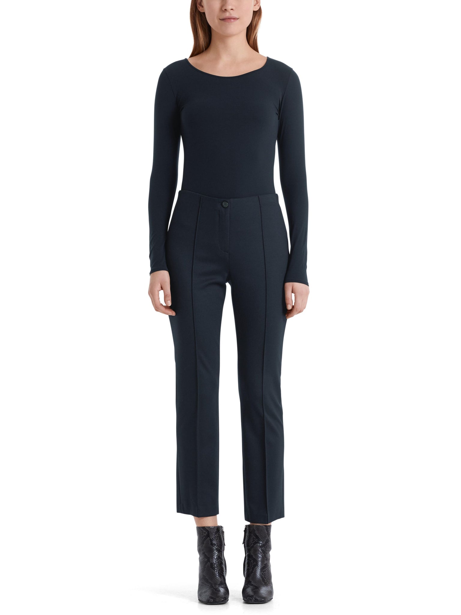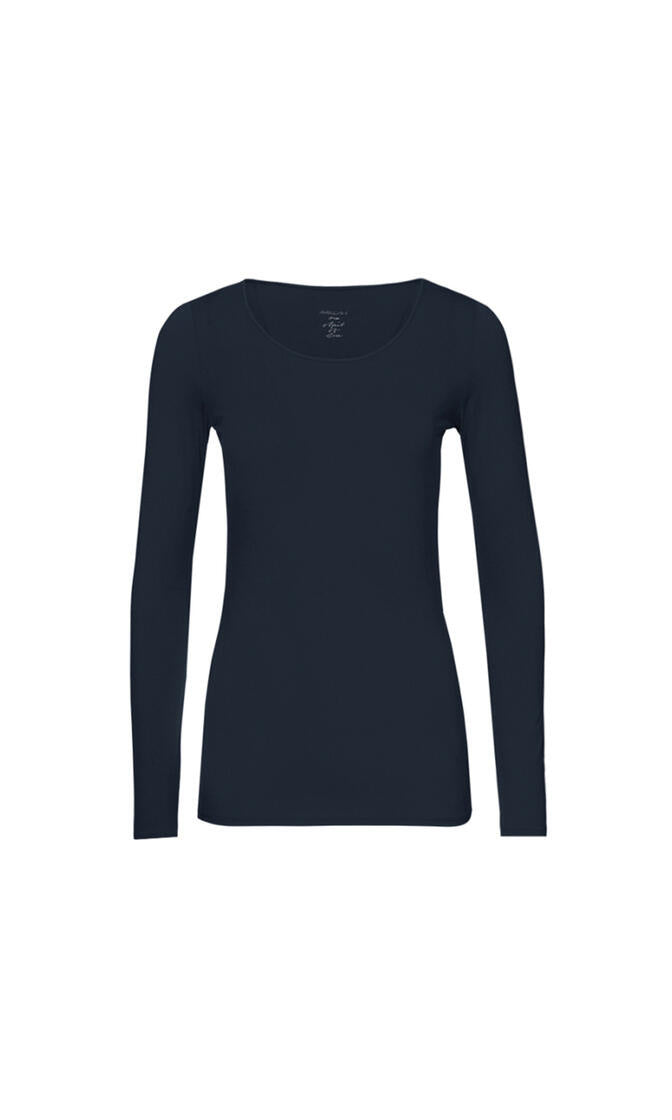 • Zartes Longsleeve|Hochwertiges Rundhals-Longsleeve aus superfeinem, dezent transparentem Material-Mix von Marc Cain. Doppelte Steppungen an Ärmelabschlüssen und Saum sowie ein schimmernder Logo-Print innen an der Nackenpartie vollenden das Design des cleanen Allrounders.|Farbe: midnight blue|Feines Stretch-Material mit weicher Haptik|Leicht taillierter Schnitt|Das Model ist 179 cm groß und trägt N3/38.|Unifarbenes Dessin