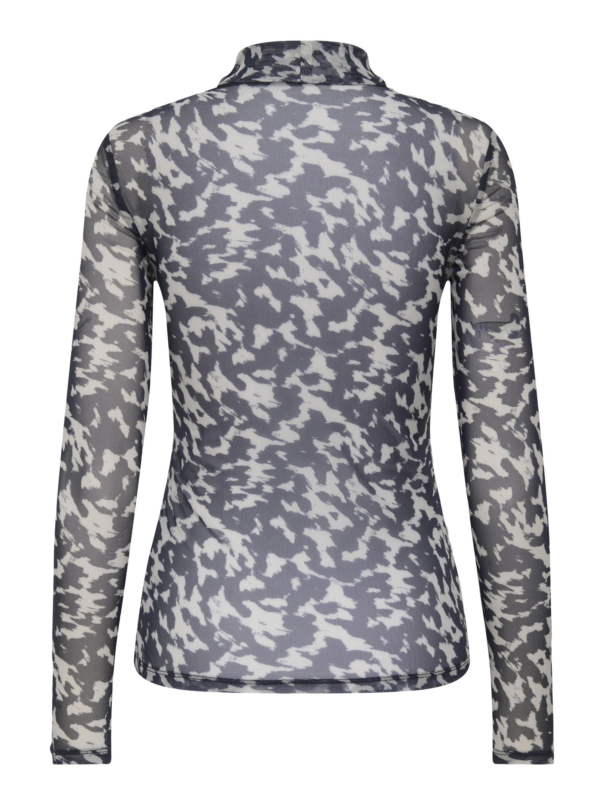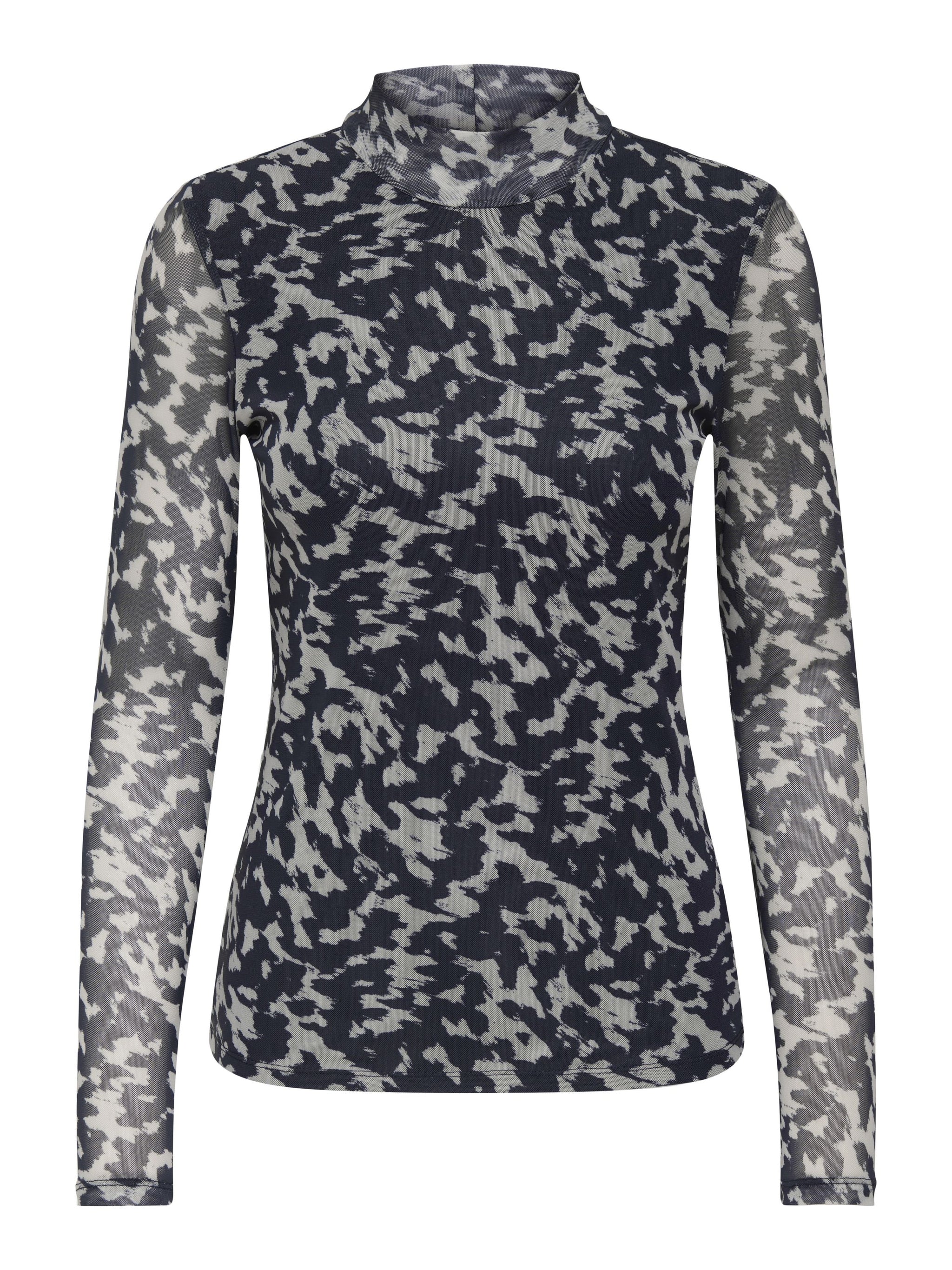 Verändere dein Alltagsoutfit in Sekundenschnelle, indem du mit einem femininen Oberteil einen weichen und schicken Akzent setzt. - Produkttyp : Top - Hals : Hoch geschlossen - Ärmel : Langarm - Details : Mesh Details - Print : Pigmentprint für einen weichen Print auf leichter Kleidung - Passform : Enger Schnitt