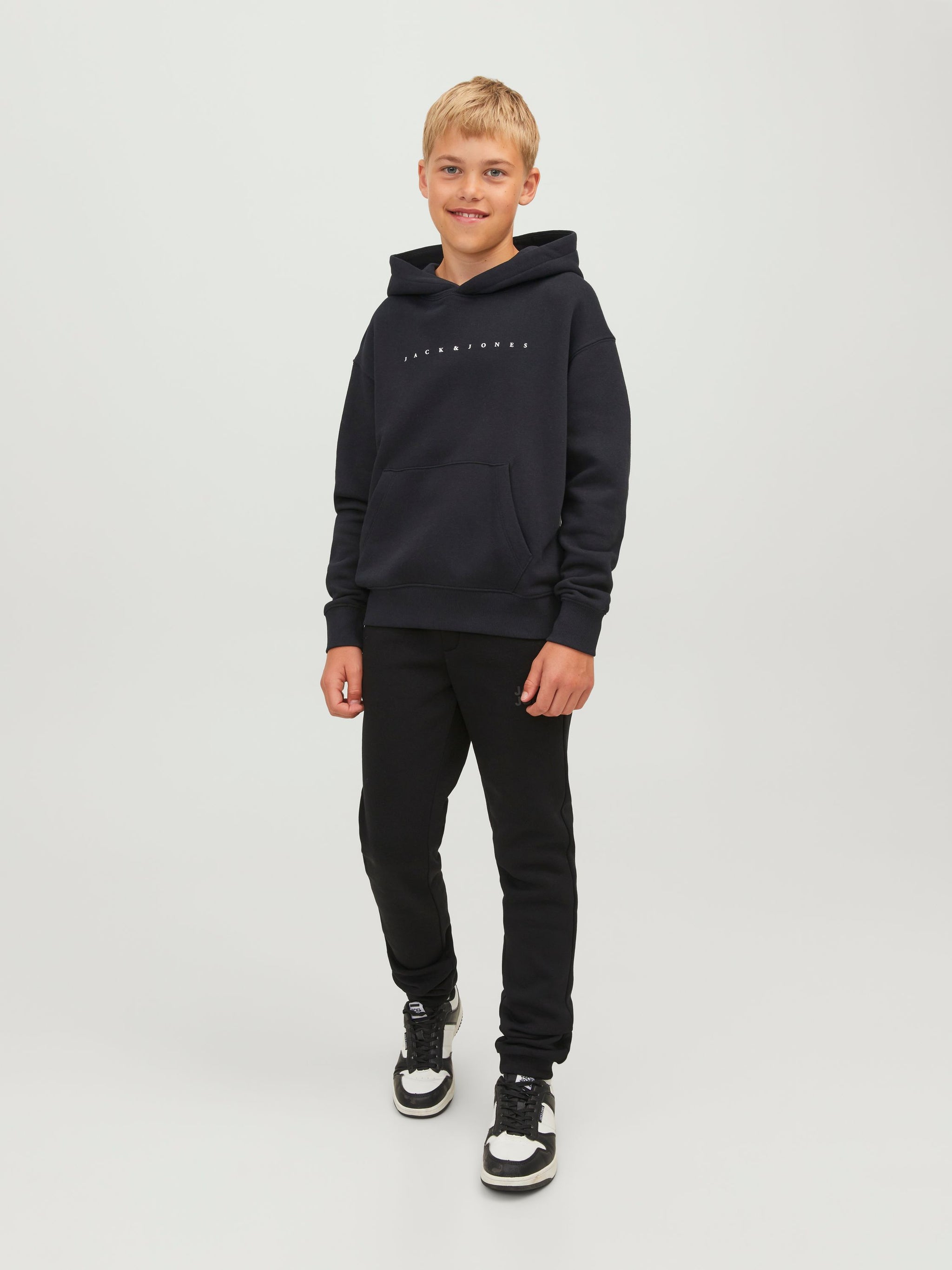 Keine Garderobe ist komplett ohne einige bewährte Basics wie Sweatpants.Angerauter Stoff mit einer weichen Innenseite. Leicht angeraute Stoffe haben eine etwas flauschigere Innenseite, die sich weich anfühlt.Entdecke die aufregende Welt von Jack and Jones Junior, in der Mode durch jugendliche Energie und lebhaften Charme zum Leben erweckt wird. Unsere Kollektionen bieten eine Mischung aus neuen, trendigen Designs, die Jungen im Alter von 3-16 Jahren ansprechen. Tauche in hochwertige und bequeme Styles ein, die speziell für junge Fashion-Liebhaber entwickelt wurden. Bei Jack and Jones Junior interpretieren wir Mode für Jungs im Alter von 3 bis 16 neu, indem wir coole Passformen und moderne Styles kombinieren und dabei immer wieder Elemente aus der Erwachsenenmode einfließen lassen.. - Produkttyp : Kapuzenpullover - Hals : Kapuze - Ärmel : Kurzarm - Ärmel : Eingesetzte Ärmel - Taschen : Känguru Tasche - Print : Gummidruck für Weichheit - Passform : Locker geschnitten