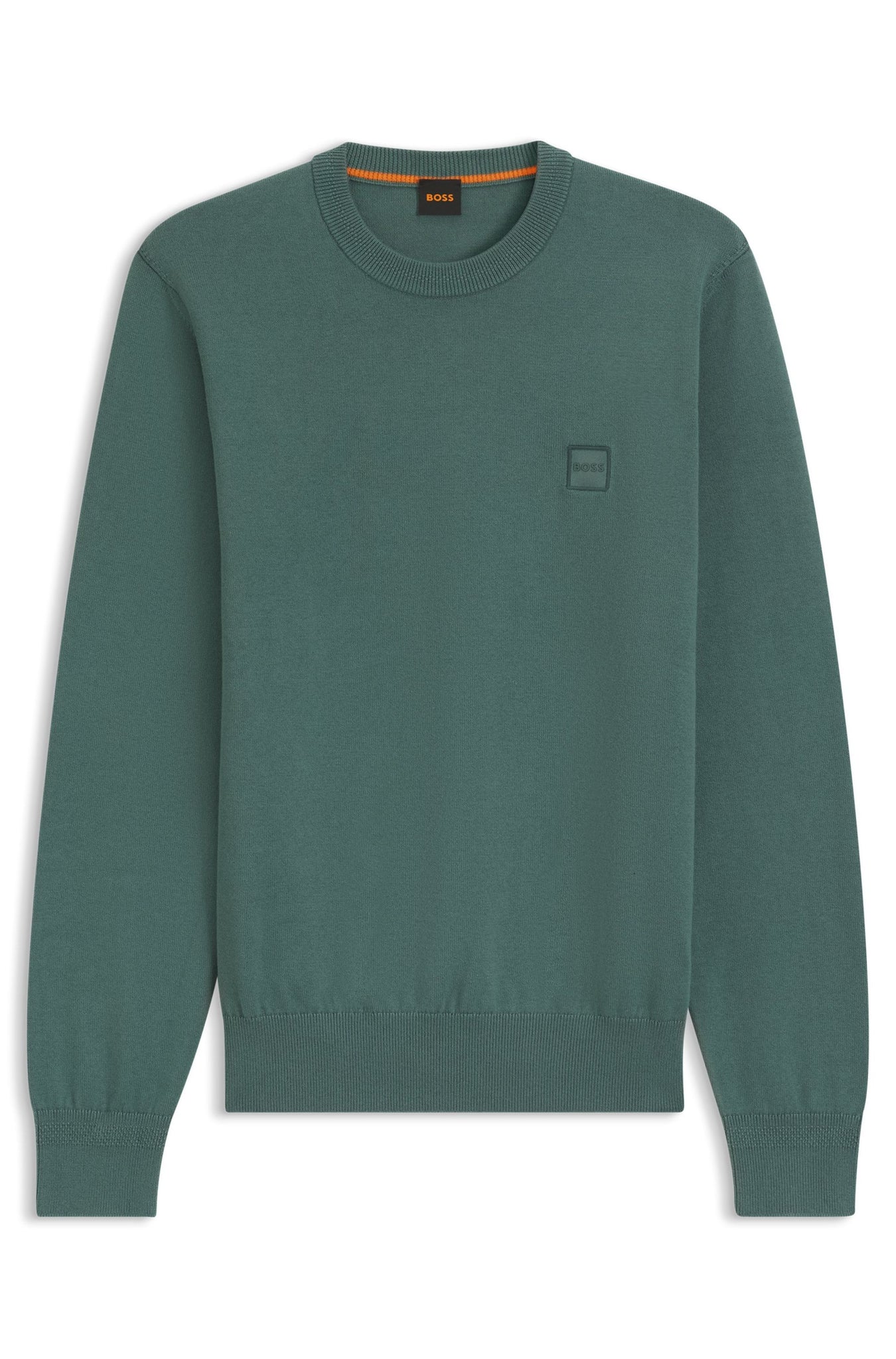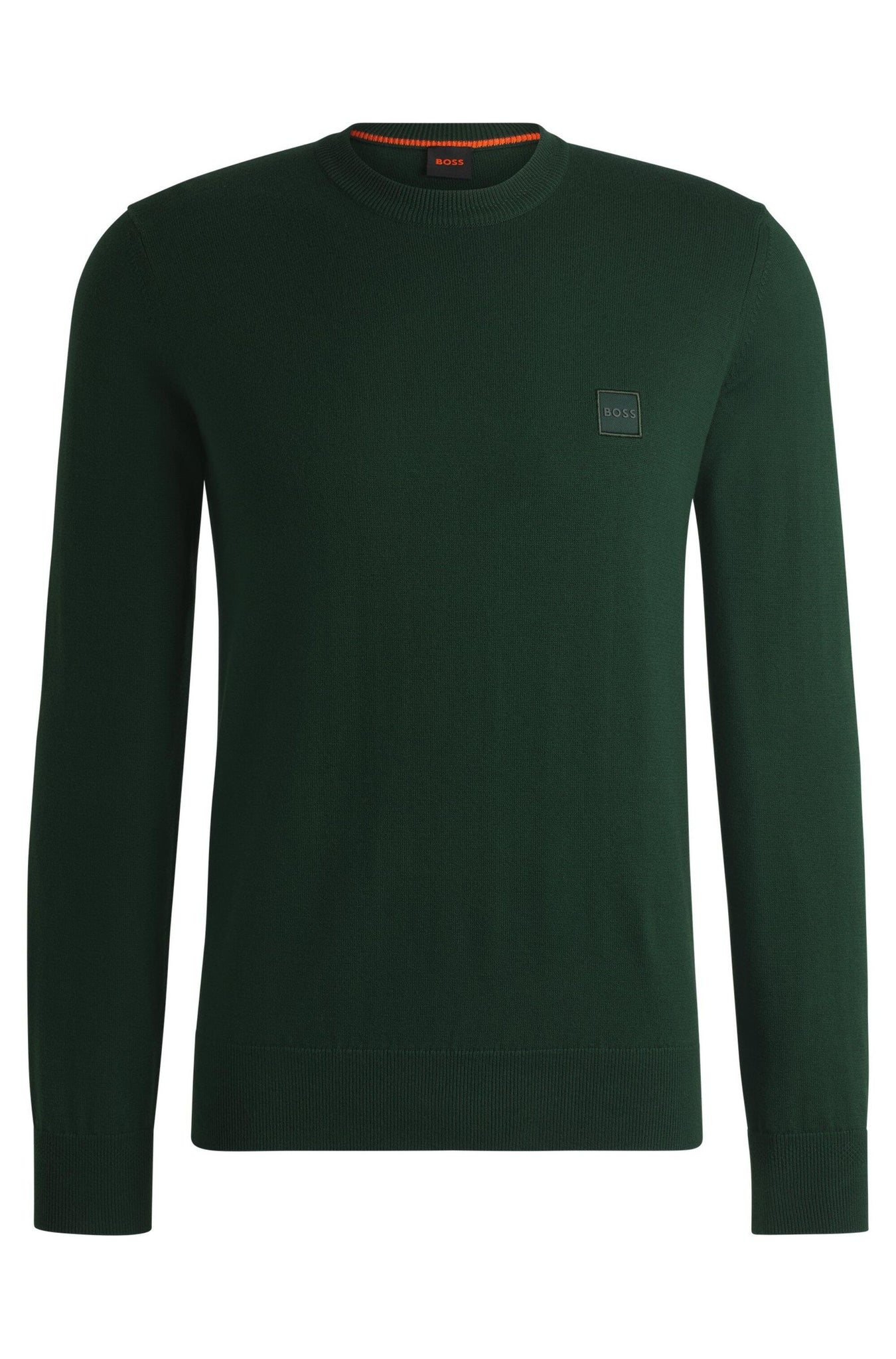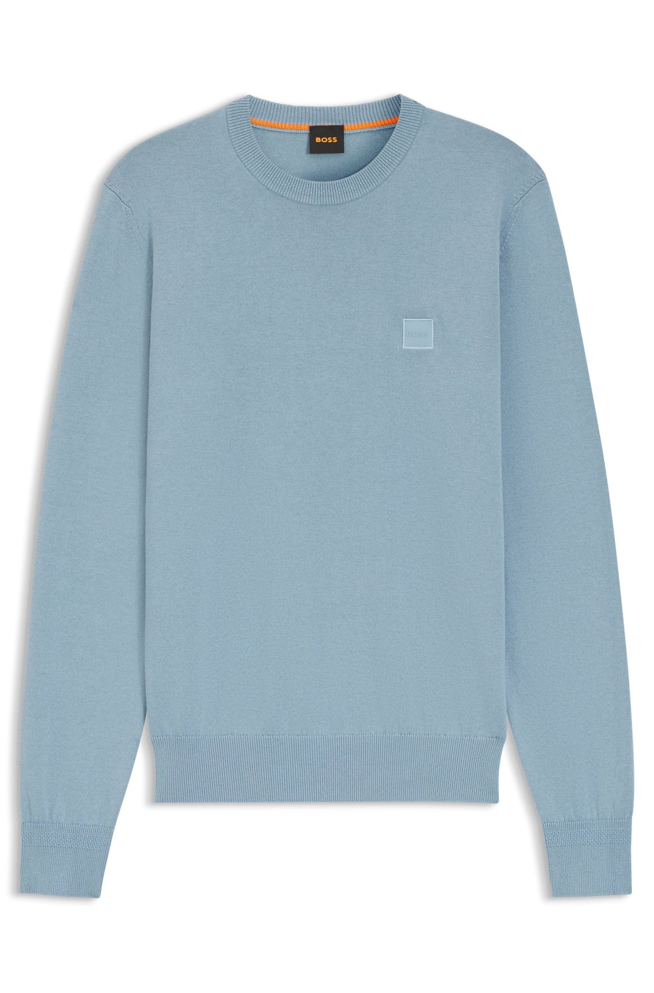 Der elegante BOSS Pullover aus einem edlen Baumwoll-Mix mit Kaschmir-Anteil ist mit einem Logo-Aufnäher versehen. Legere gerade Passform.