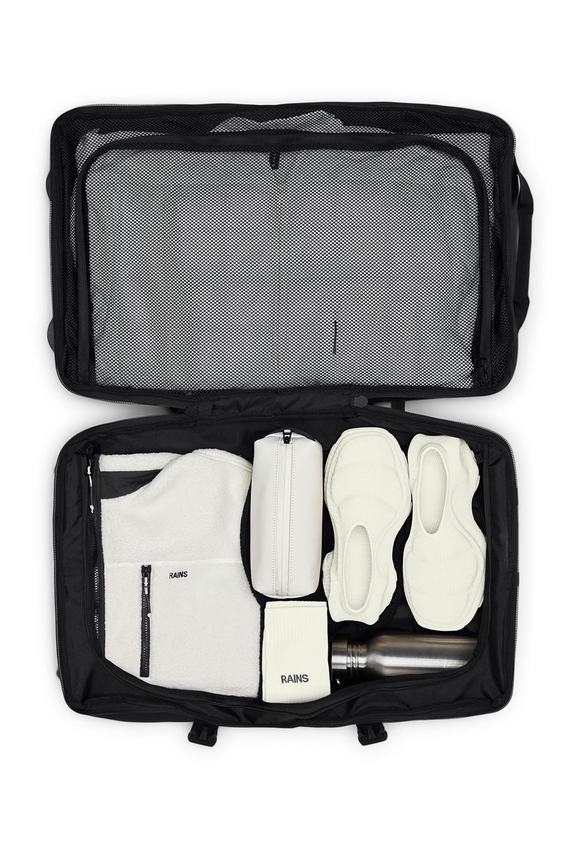 Dieser Trolley aus wasserdichtem Polyester bietet hohe Funktionalität mit zwei geräuschlosen Rädern und einem Teleskop-Komfortgriff. Die Bifold-Tasche verfügt über zwei Netzverschlüsse für eine organisierte Aufbewahrung. Ein elastisches Crossband sorgt für zusätzlichen Halt und Stabilität. Ideal für komfortable Reisen und perfekten Schutz der persönlichen Gegenstände.
