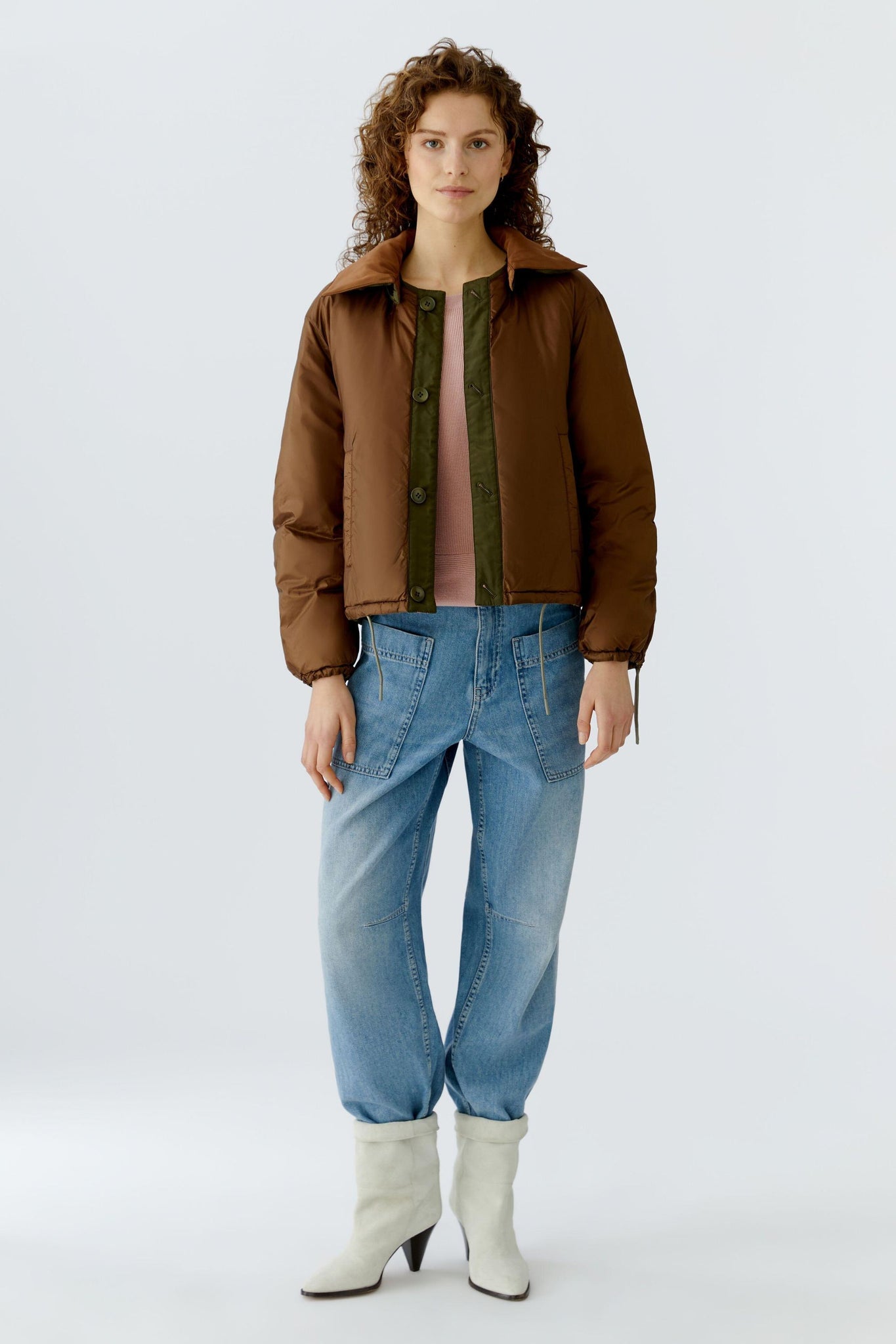 Gestepptes Nylon mit leichtem Padding Oversized geschnitten, verkürzte Länge Kragen kann abgeknöpft und auch von beide Seiten, je nach Farblaune, gestylt werden Überschnittene Schulter, fällt locker zum Langarm Ärmel und Saum durch Kordel in der Weite justierbar Zwei aufgesetzte Taschen und zwei Eingriffstaschen * Länge bei Größe 36: 58cm